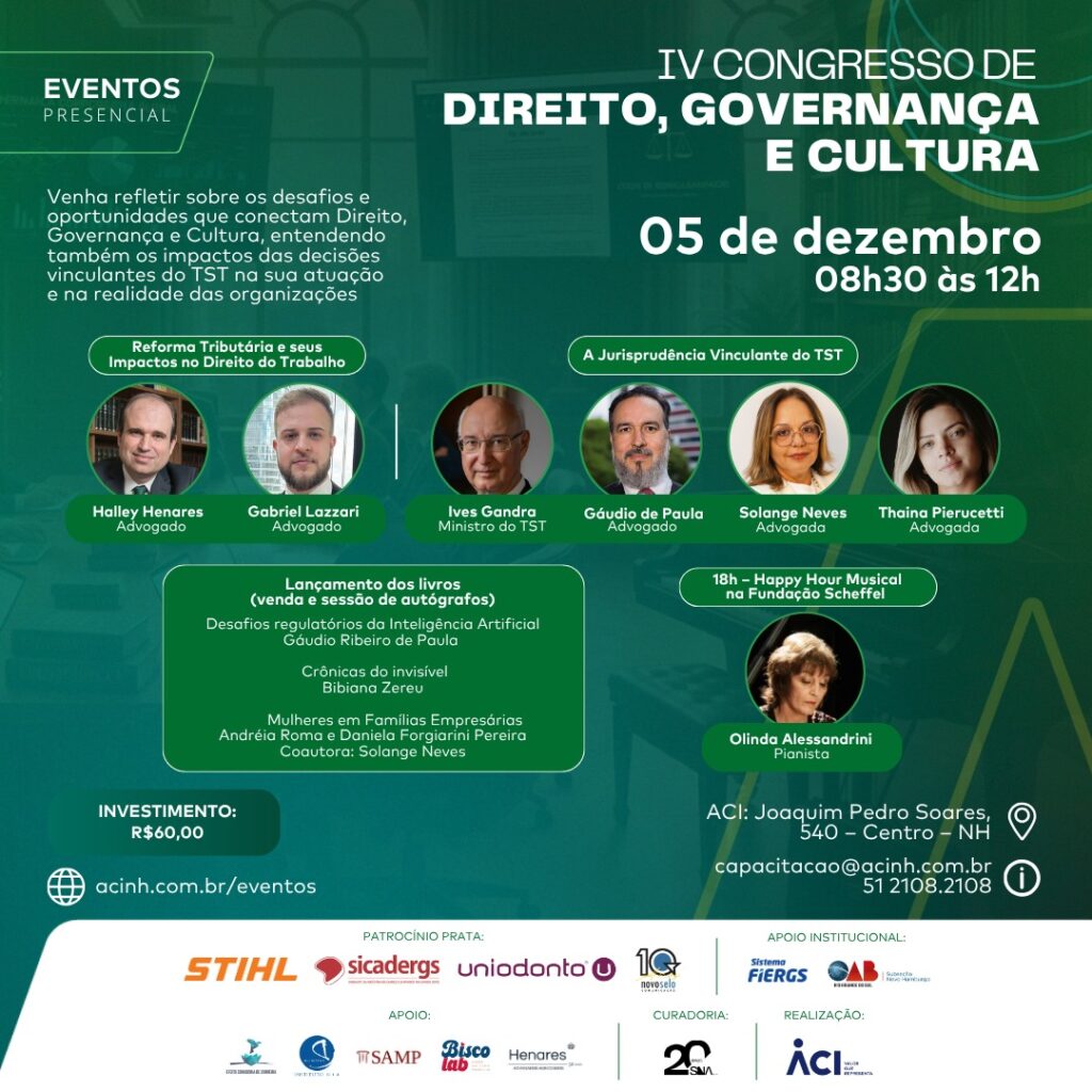 Nesta edição, serão debatidos temas como Reforma Tributária e seus impactos no Direito do Trabalho e a jurisprudência vinculante do TST, com a presença de grandes nomes do Direito:Halley Henares, Gabriel Lazzari, Ministro Ives Gandra, Gáudio de Paula, Solange Neves e Thaina Pieruccetti.